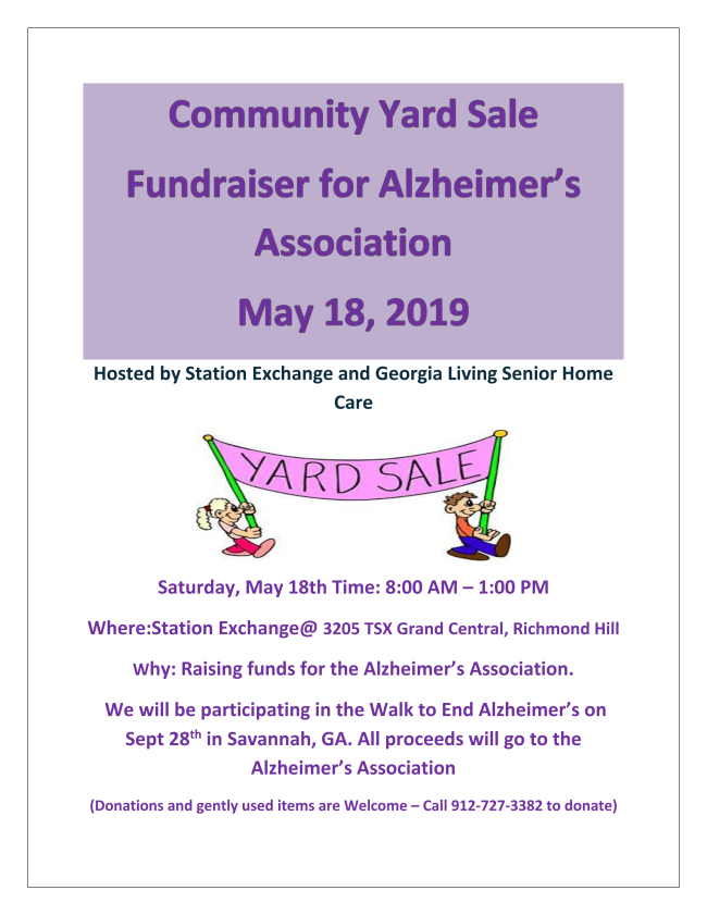 Community Yard Sale Fundraiser for Alzheimer’s Association is hosted by Station Exchange and Georgia Living Senior Home Care.